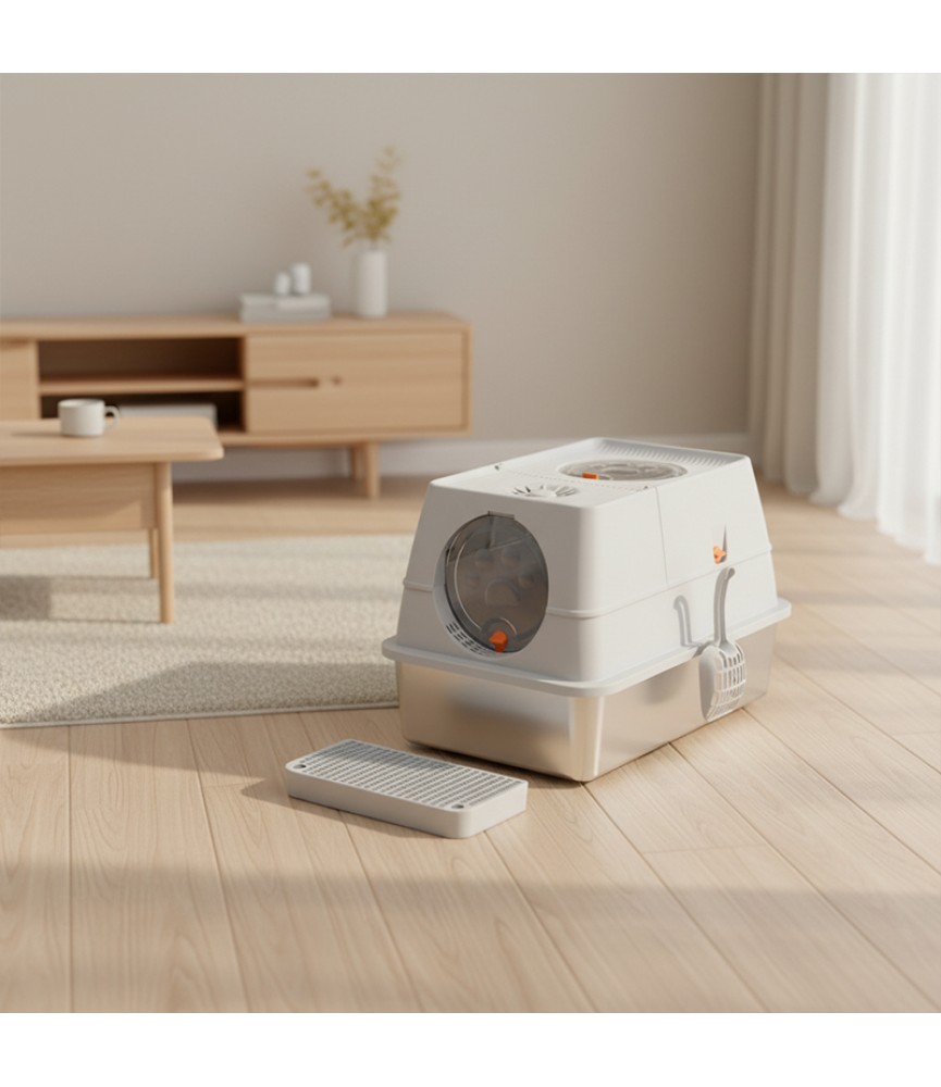 Centered on eco-friendly materials and a spacious structural design, this litter box provides cats with a safer and cleaner environment for their needs. It features a composite construction of stainless steel and PP; the inner liner boasts natural corrosion resistance and non-stick properties, preventing odor retention and making cleaning effortless. The fully enclosed housing effectively contains odors while offering cats a more private space for elimination. Its spacious interior is ideal for large cats or multi-cat households, and the entrance is designed to allow cats to enter and exit without stress. The overall structure is sturdy and durable, ensuring suitability for long-term use.
